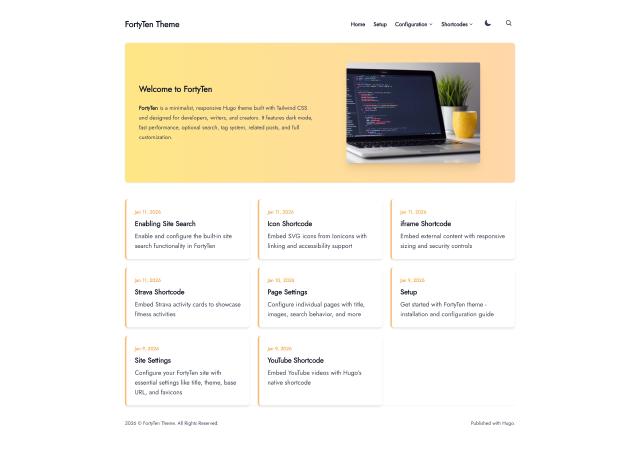 FortyTen is a minimalist, responsive Hugo theme for personal blogs and developer portfolios, built with Tailwind CSS and supporting dark mode.
