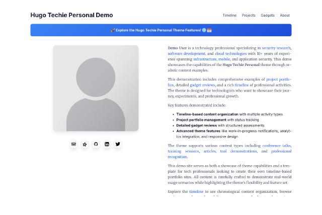 A timeline-based personal site theme for tech professionals who love to share their work, projects, and journey with the community. Features activity-based timelines, project showcases, gadget reviews, and comprehensive configuration options.
