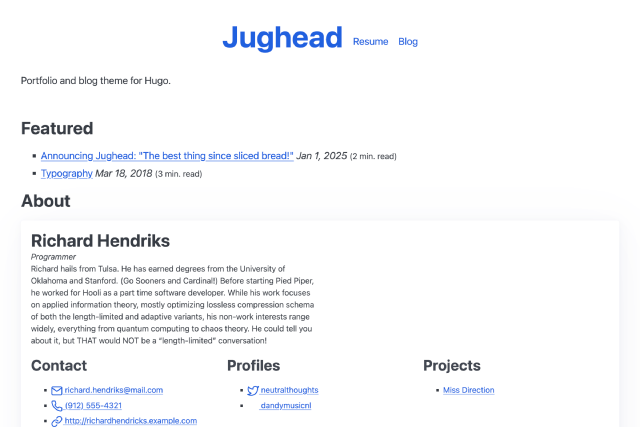 Jughead is a simple and powerful portfolio and blog theme for Hugo. It features a Resume page, Giscus comments, Mermaid diagrams, and KaTeX formulae.